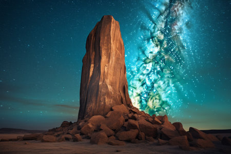 Ancient standing stones silhouetted against a breathtaking night sky, filled with the milky way's vibrant colors and countless stars. ideal for astronomy, night sky photography, and cultural studies in ancient monuments. AI generation