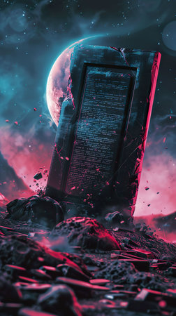 A large, golden obelisk is surrounded by a field of rocks and debris. The sky above is filled with colorful swirls and stars, creating a sense of wonder and mystery