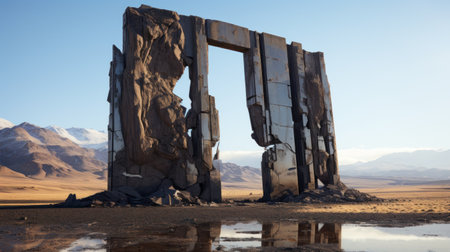 A captivating stone archway stands against a twilight sky, illuminated by a subtle glow. This mystical landscape captures the essence of ancient history and natural beauty.