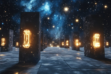 Stone pillars with glowing lanterns create a mysterious pathway beneath a dazzling night sky filled with stars.