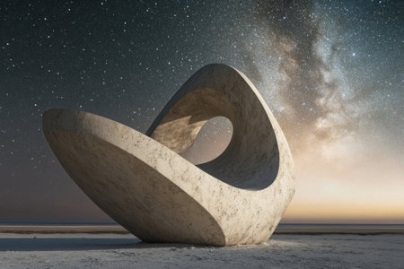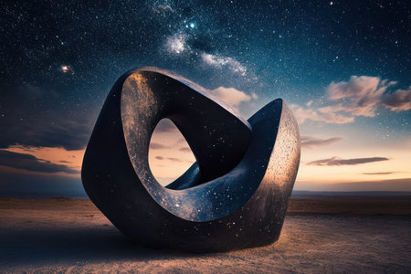 Stunning abstract sculpture illuminated by stars, set in a calm, open landscape at dusk.
