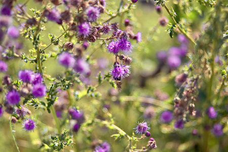 Purple thistle flowers in a meadow on a sunny day