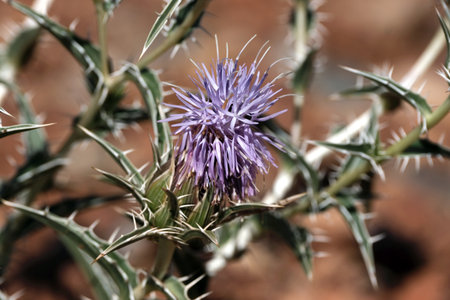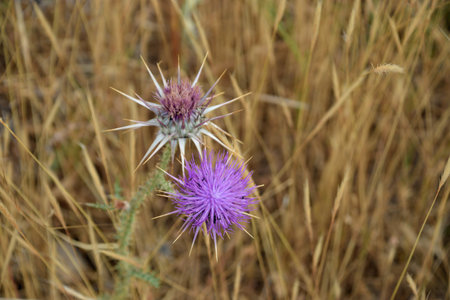 Thistle flower at the edge of a road near the Llobregat river in the Baix Llobregat region. Spring colors. Mediterranean colors.