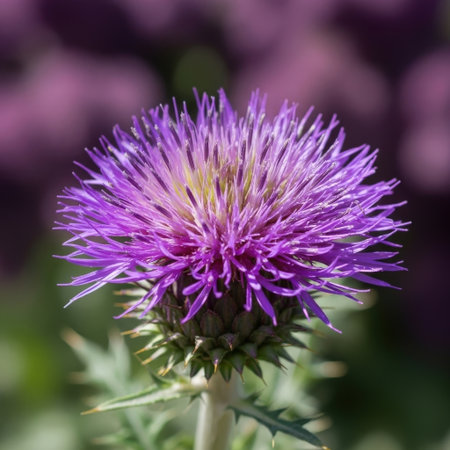 Thistles growing wild in sunlight. Purple bull thistle with prickly spines on stalk. More thistles on defocused background.