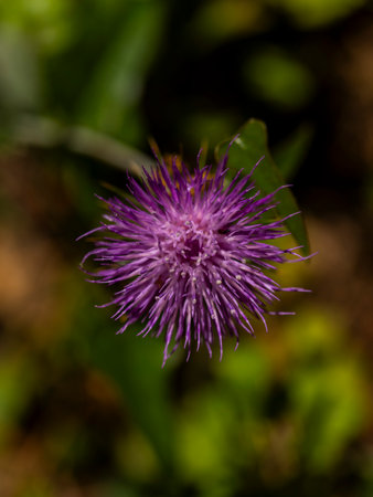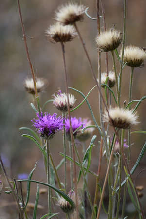 Blooming plant Carthamus duvauxii or Carduncellus rhaponticoides with purple flowers, met in Morocco, Atlas Mountains