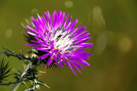 Purple thistle flower on a green background with bokeh