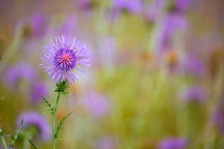 Beautiful purple thistle flowers in a meadow. Selective focus.