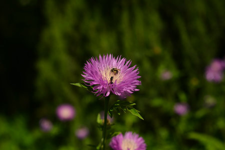 Purple and white cornflower flower with a bee. Selective focus
