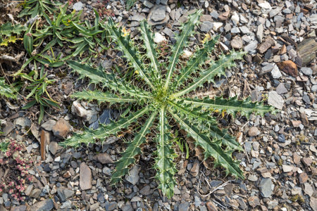 Cirsium pugnax, rosette of leaves on roadside scree