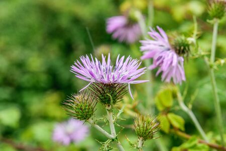 Purple thistle flowers close-up on blurred green background.