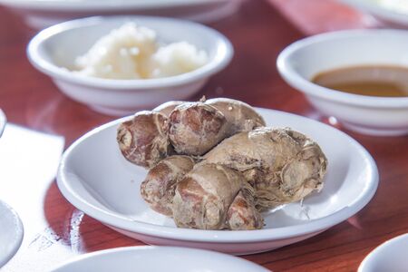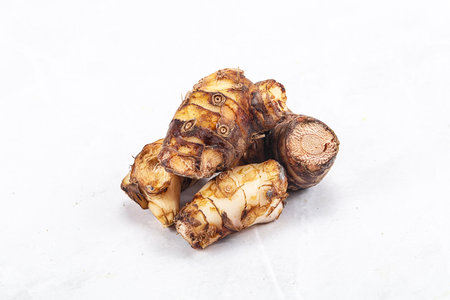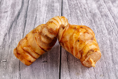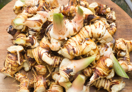 fresh taro root on wooden table, top view, close up