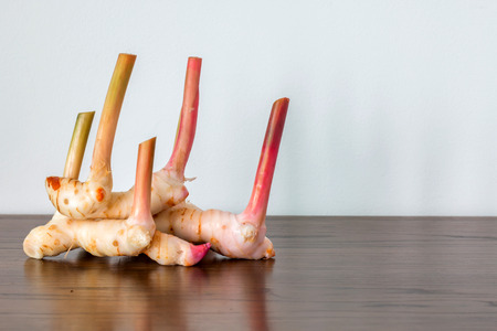 Galangal or Lengkuas roots over wooden background