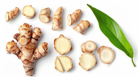 Galangal rhizomes with sliced sections and a green leaf, isolated on white background, top view