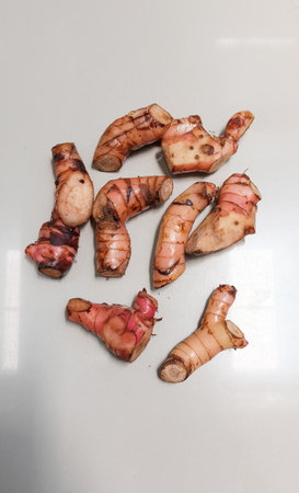 Raw Jerusalem artichoke isolated on white background. Freshly dug tubers ready to cook, flat lay, mockup, template