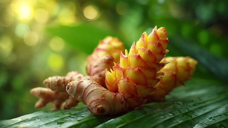 Exotic Ginger Flower and Root on Vibrant Green Leaf Background