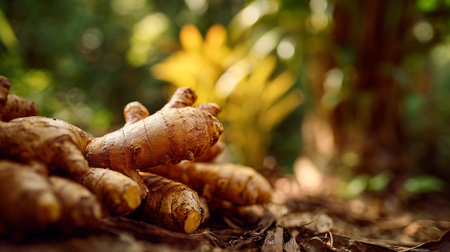 Freshly Harvested Turmeric Root Resting on the Earth, Ready for Cooking