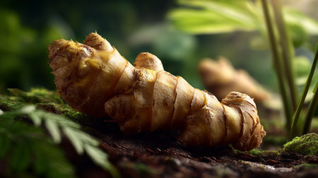 Natural Ginger Root Resting Amongst Verdant Moss and Lush Foliage