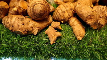 Pile of fresh ginger roots displayed on a green surface showcasing their rough texture and earthy tones, creating a warm and natural feeling.