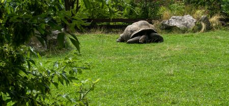 Giant turtle in the highlands of Santa Cruz island. Galapagos turtle is the largest living species of tortoise, reaching weights of over 400 kilograms, lengths of 1.8 meters and live up to 150 years.