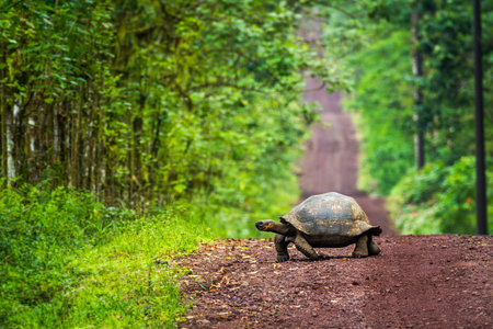 Giant Tortoise or turtle walking through mud in forest on the island of Santa Cruz in the Galapagos