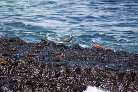 Sea bird at the edge of a tidal pool at Punta Espinoza, Fernandina Island, Galapagos, Ecuador