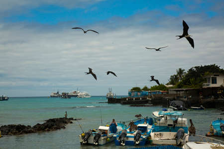 SANTA CRUZ, ECUADOR, 05 JULY 2019. Frigates fly over Santa Cruz Island in the Galapagos Islands, Ecuador.