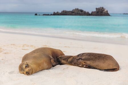 Ecuador. The Galapagos Islands. Seals are sleeping on the beach. Beaches of the Galapagos Islands. Pacific Ocean. Seals in Ecuador. Animals of the Galapagos Islands. island of Bartolome