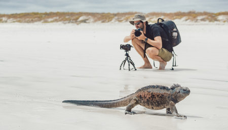 Galapagos islands wildlife photography photographer tourist man taking photos of marine iguana walking on Tortuga Bay beach, Santa Cruz island. Galapagos cruise travel. Eco-tourism in Ecuador