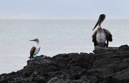 Blue footed Bobby and Pelican on the rocks of the Galapagos Islands