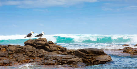 A pair of large seagull sitting on a rock on Cape Towns wild coastline
