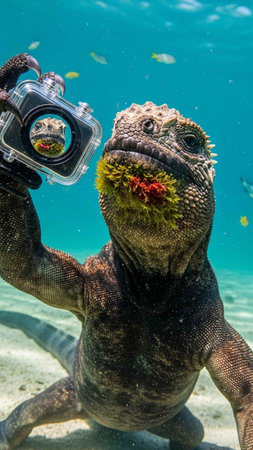 A marine iguana holds a camera underwater amidst vibrant sea life