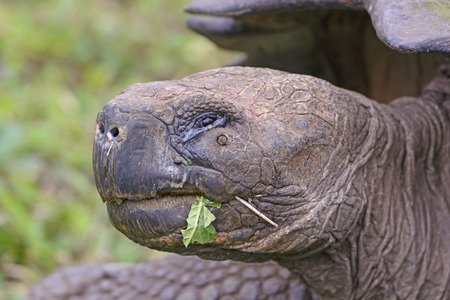 Closeup head on portrait of a wild Galapagos Tortoise (Chelonoidis nigra) with food in mouth in the Galapagos Islands, Ecuador.