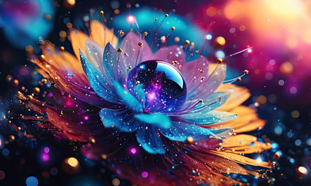 A mesmerizing water lily floats serenely in a cosmic background, illuminated by radiant light and sparkling bokeh, capturing the essence of beauty and tranquility.
