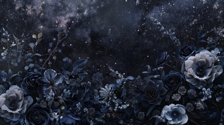 Mystical Night Sky with Dark Floral Arrangement and Starry Background