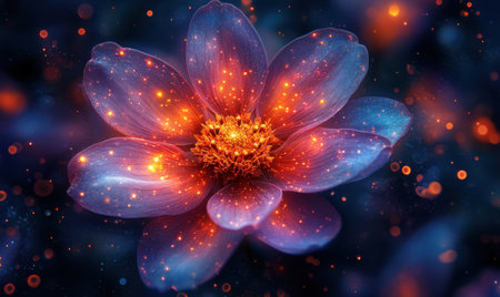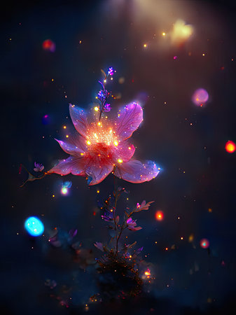 AI generated glowing cosmic flower blooming in darkness with radiant warm core and sparkling light particles floating around detailed petals creating mystical energy atmosphere for fantasy design