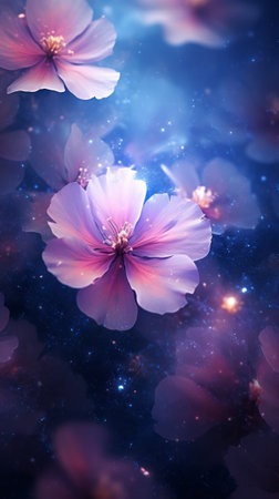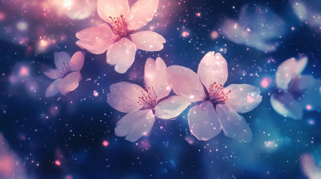 A captivating image of cherry blossom petals drifting against a dreamy night sky, featuring a sparkling bokeh effect that adds an ethereal quality.