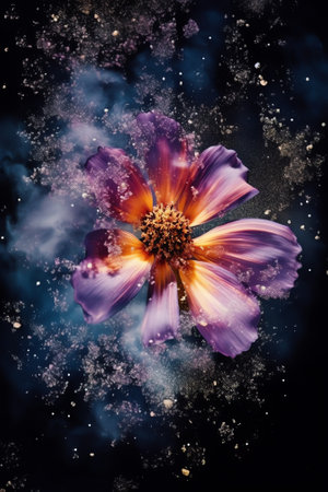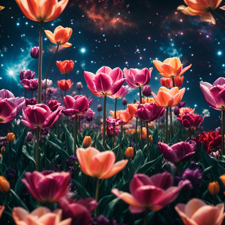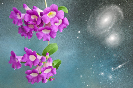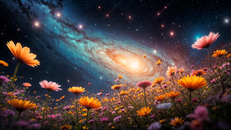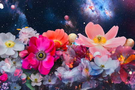 This unique surreal floral composition places vibrant flowers over a captivating galactic sky. The artistic arrangement blends natural beauty with cosmic wonder for a striking image.