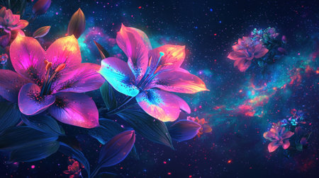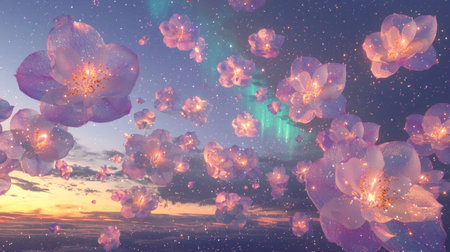 Enchanting Floral Aurora Borealis Night Sky with Glowing Cosmic Blooms Vibrant digital artwork depicting a fantastical otherworldly landscape of luminous flowers against a backdrop of swirling