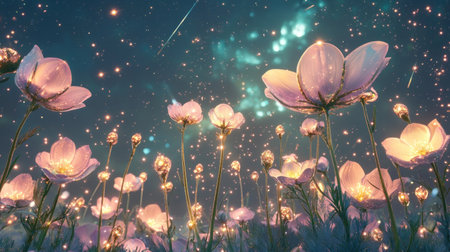 Ethereal Celestial Garden of Glowing Floral Blooms under Starry Skies A magical dreamy landscape with vibrant colorful flowers illuminated by the light of the night sky and distant galaxies