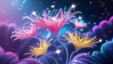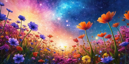Vibrant flowers glow under a shimmering celestial sky in a magical landscape at dawn