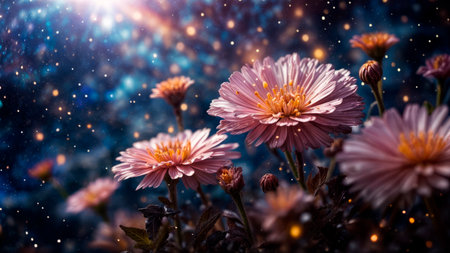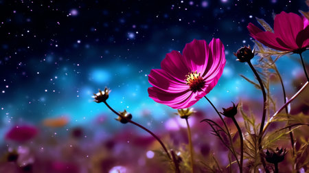 A captivating scene featuring delicate cosmos flowers with soft petals set against a dreamy blue background, filled with gentle sparkles that create a serene atmosphere.