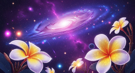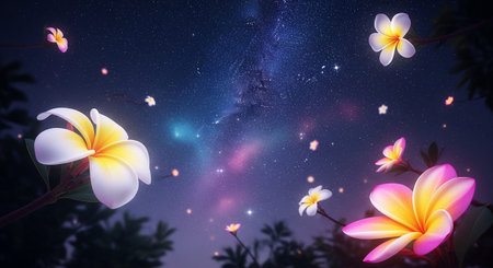 Delicate plumeria flowers in shades of white, yellow, and pink are scattered across the frame, appearing to float against a night sky. The sky is a canvas of deep blues and purples, illuminated by the swirling bands of the Milky Way and countless twinkling stars. Small, glowing orbs add to the magical, dreamlike atmosphere. Dark silhouettes of foliage frame the scene, enhancing the celestial display.