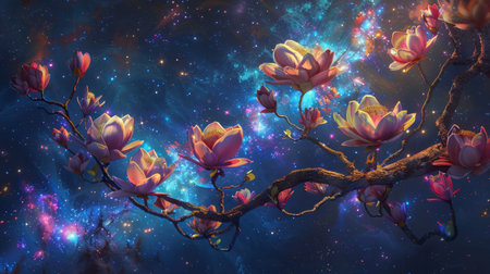 Celestial blooms decorating a cosmic tree each flower a mini galaxy wallpaper