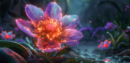 A beautiful flower displays vibrant colors and glowing patterns against a dark background, creating a mesmerizing and enchanting effect in the composition.