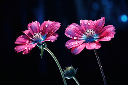 Exotic purple and blue flower with bright petals, gently dripping water on a dark background, generative ai