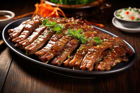 platter with heap of glazed pork ribs viewed from above, created with generative ai
