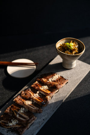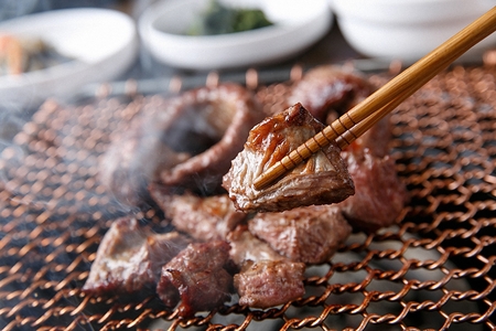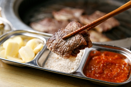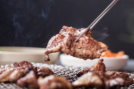 Korean barbecue, beef prime ribs held with chopsticks, close-up shot