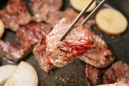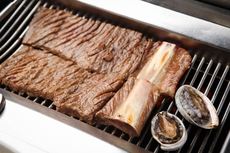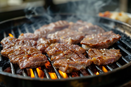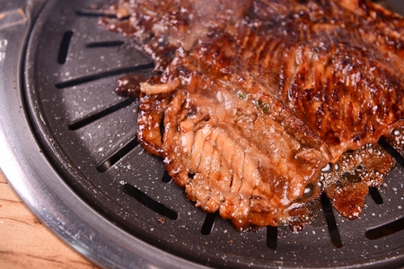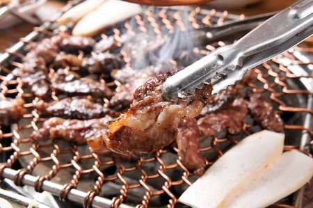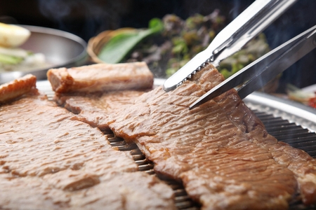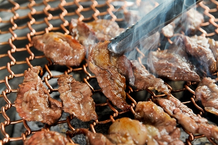 Close-up of meat grilling on a Korean style barbecue grill with tongs