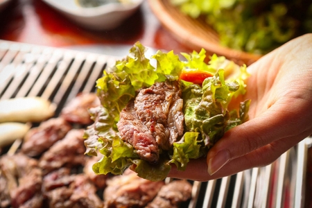 grilled beef chuck flap tail wrapped in lettuce with garlic and Doenjang, soy bean paste