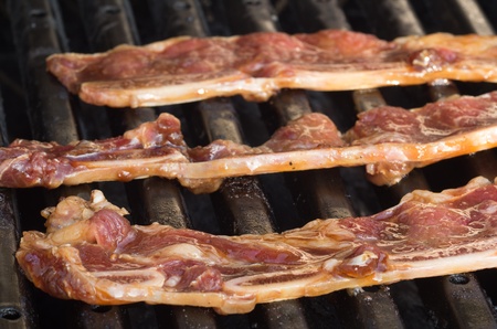 Soy sauce marinated beef ribs being grilled on charcoal grill